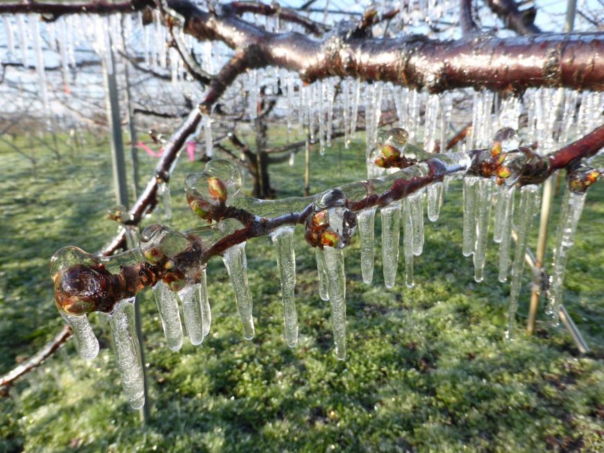 さくらんぼは、降霜の被害を受けると雌しべが凍結・枯死して実が成らなくなります。雌しべは、開花直前が最も低温に弱くなります。このため、生産者は霜の凍結からさくらんぼの雌しべを守るため、樹の周りで火を焚く対策(燃焼法)のほか、樹上からスプリンクラーで散水し、水が凍る際に発する熱で花芽を守る対策(散水氷結法)などを実施しています。